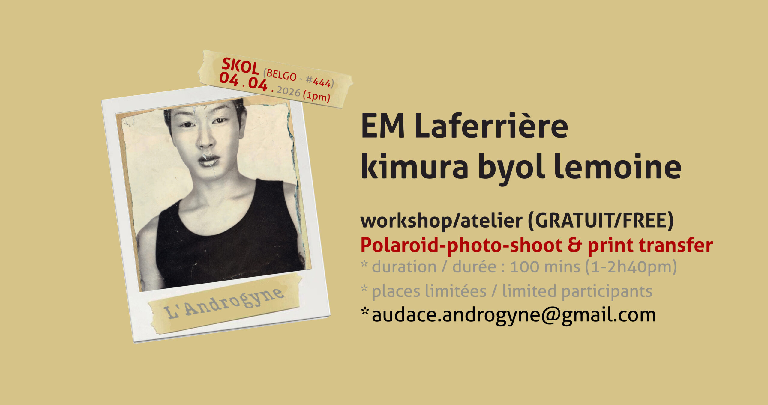GRATUIT + places limitées. Pour s’inscrire: audace.androgyne@gmail.com.